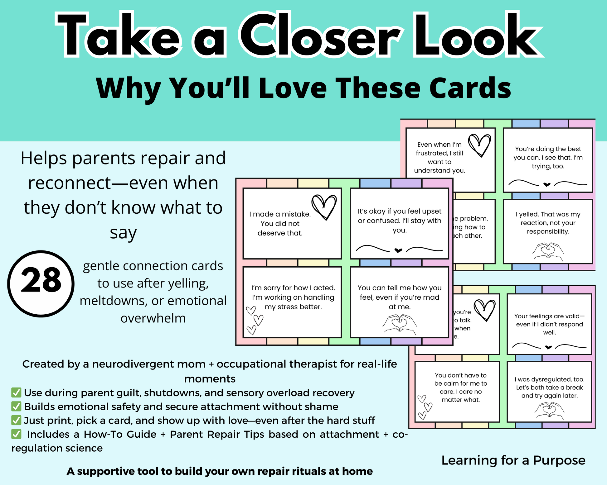 28 printable connection cards with gentle, direct phrases to use after yelling or meltdowns