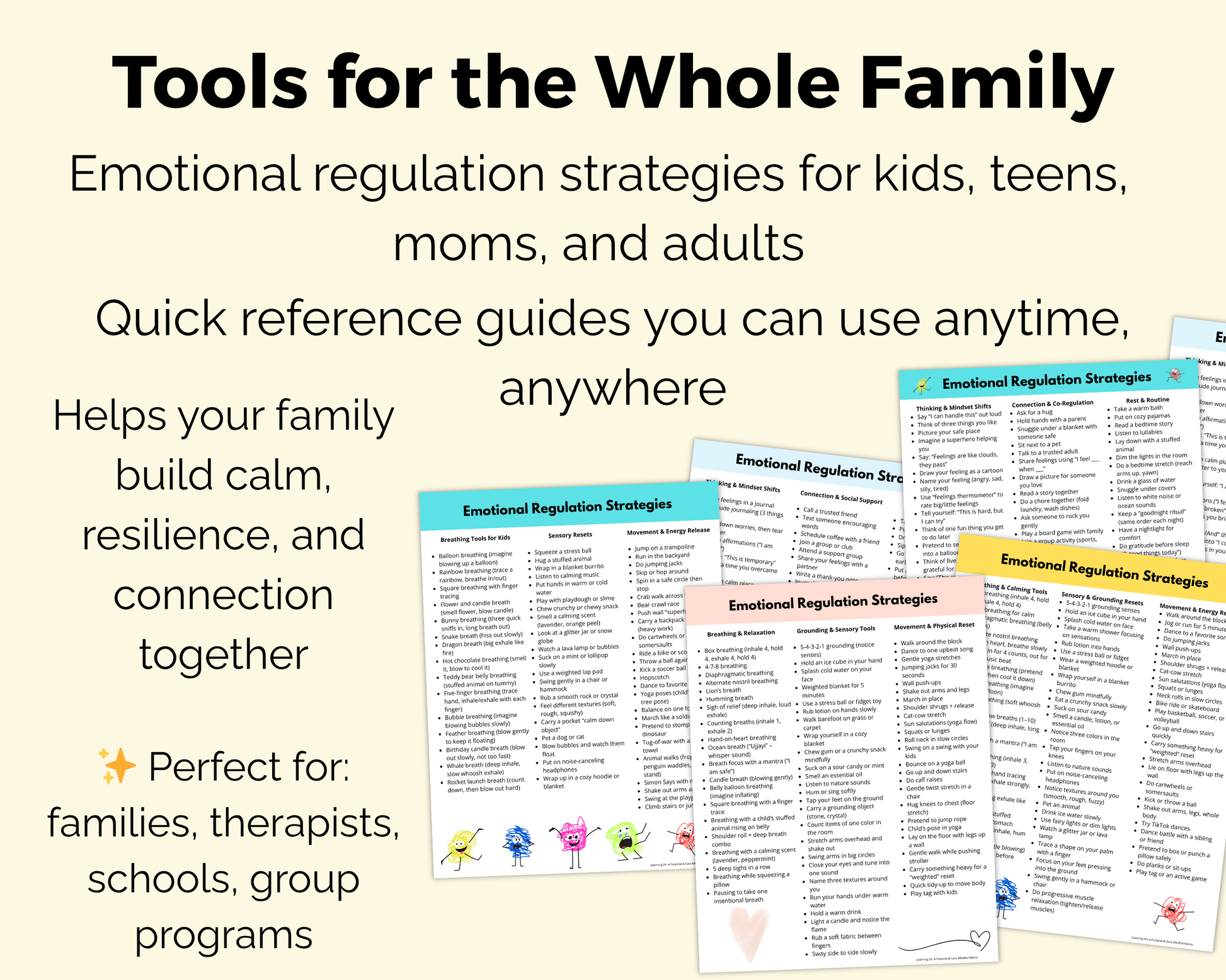 This Family Bundle includes all four 2-page Quick Reference Guides — for kids, teens, moms, and adults — giving you 600 practical strategies to help your whole household find calm, reduce overwhelm, and build resilience.