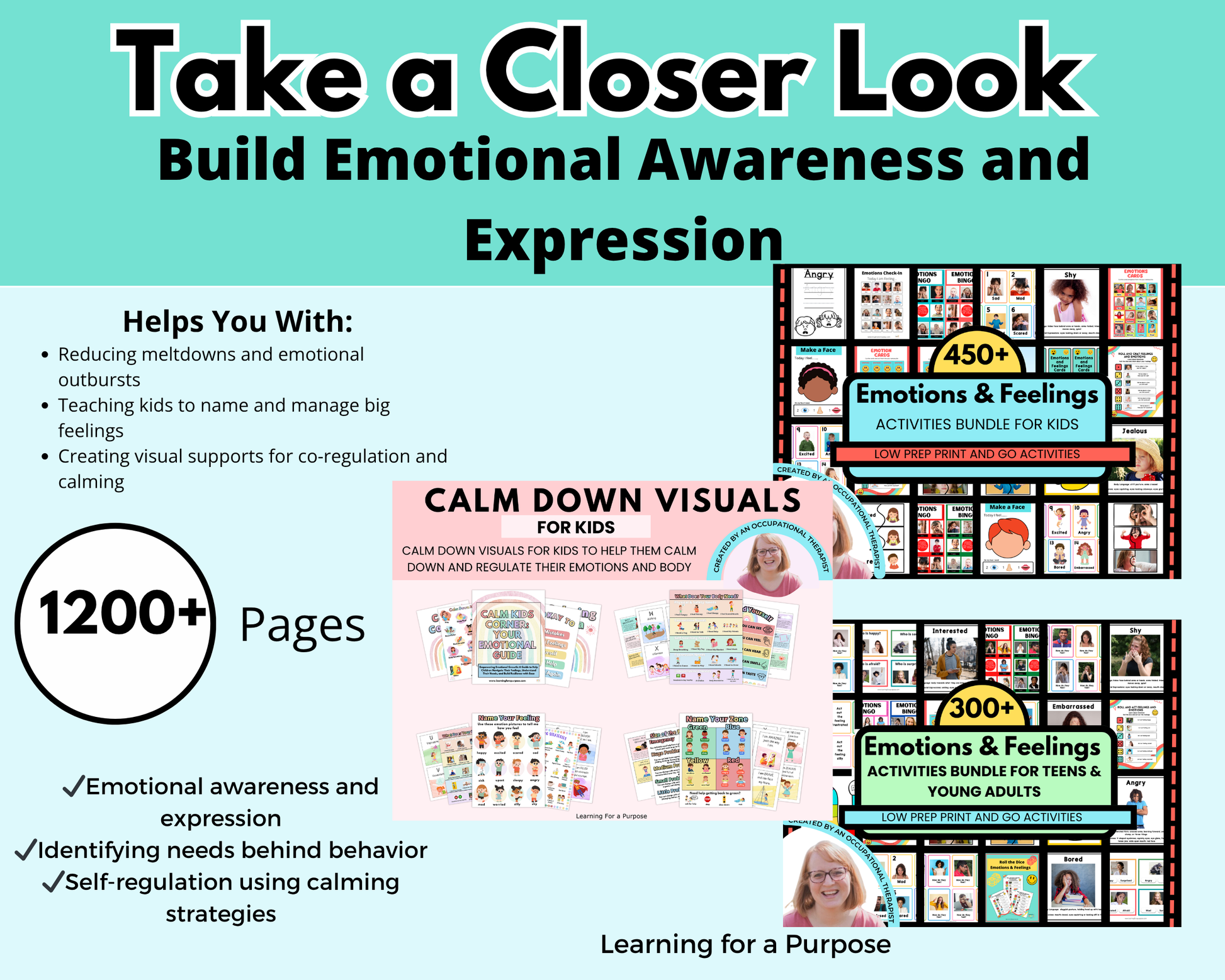 A powerful collection of printables to help kids, teens, and families recognize, express, and regulate emotions. Created by an occupational therapist and mom, this bundle includes emotion activities, calming visuals, connection tools, and regulation tools.