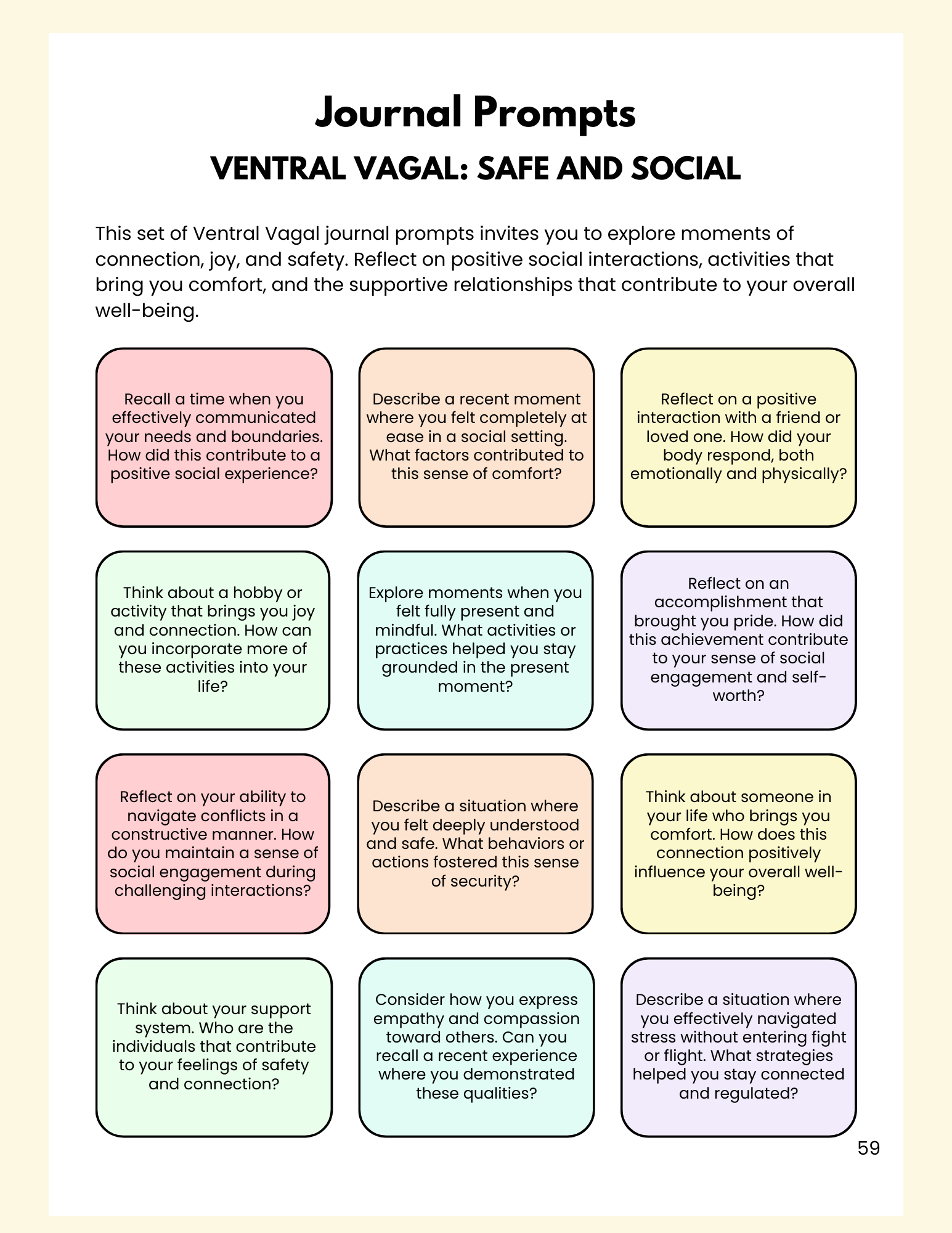 - Daily Practices: Incorporate the self-regulation techniques, exercises, and journal prompts into your daily routine to promote ongoing emotional and nervous system health.