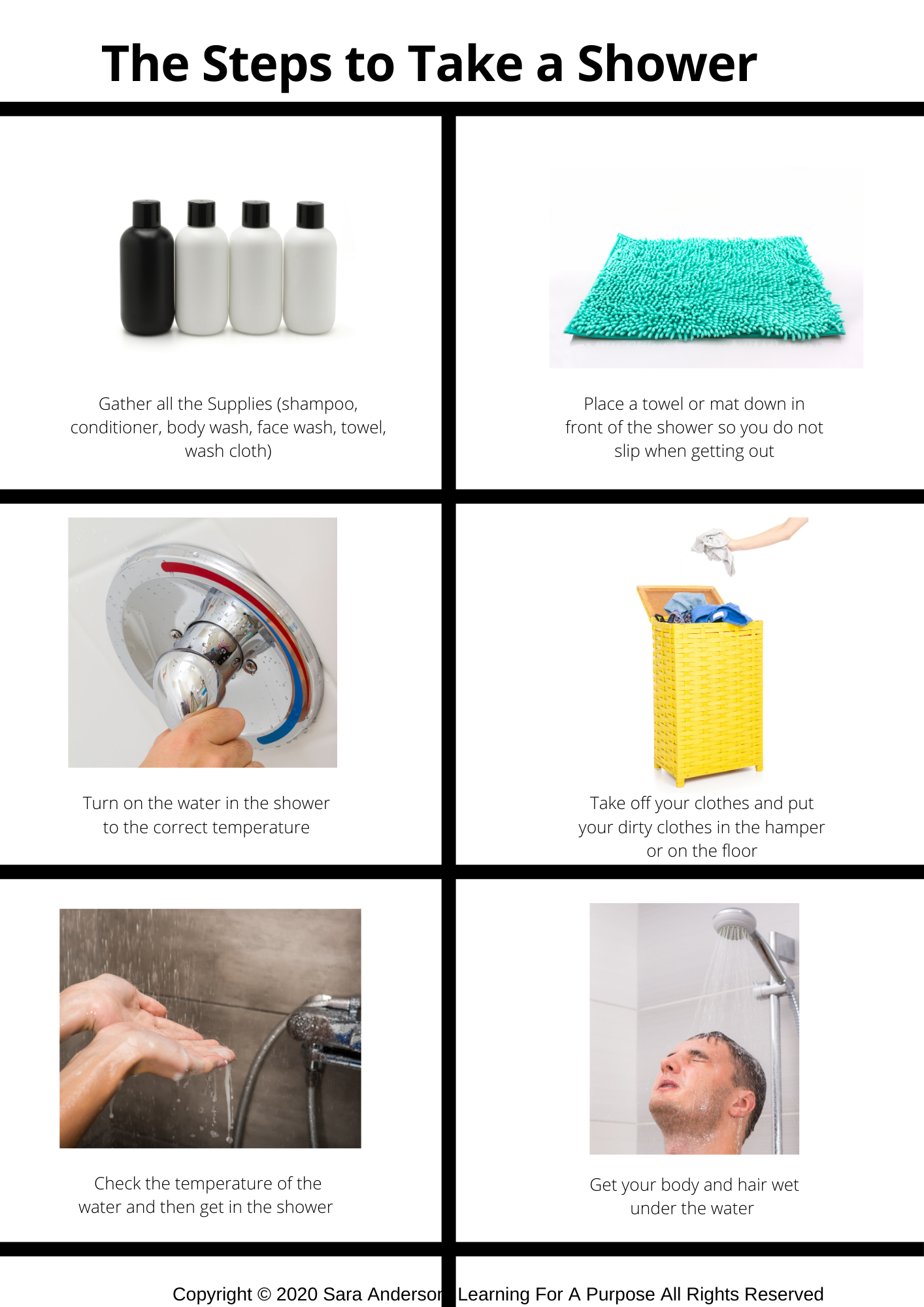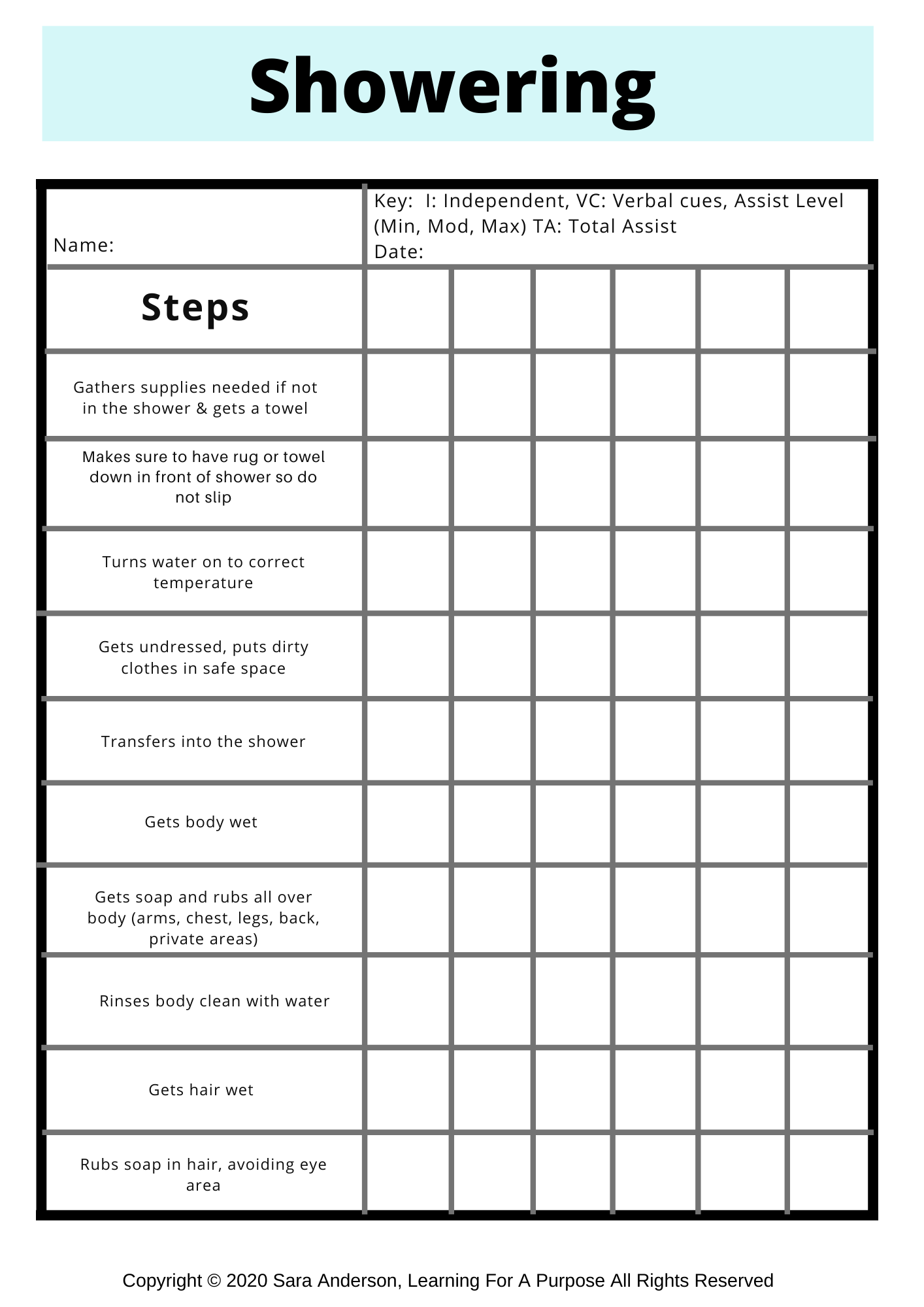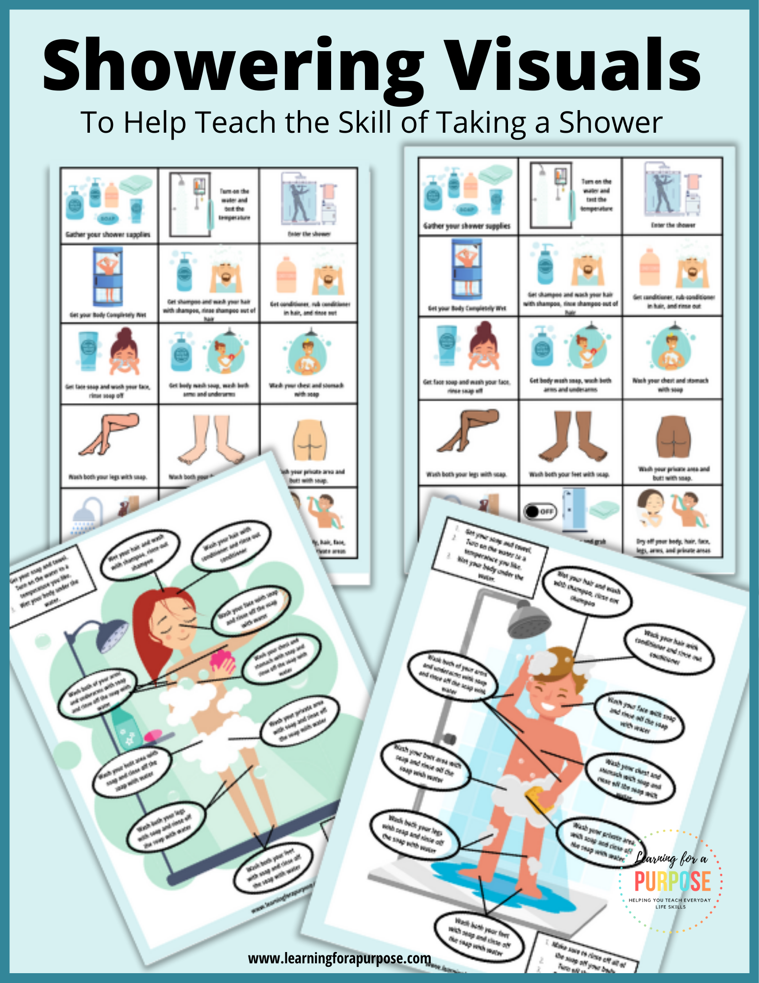 - Showering Toolkit Bundle: Step-by-step instructions and visuals for taking a shower, tailored for boys and girls.