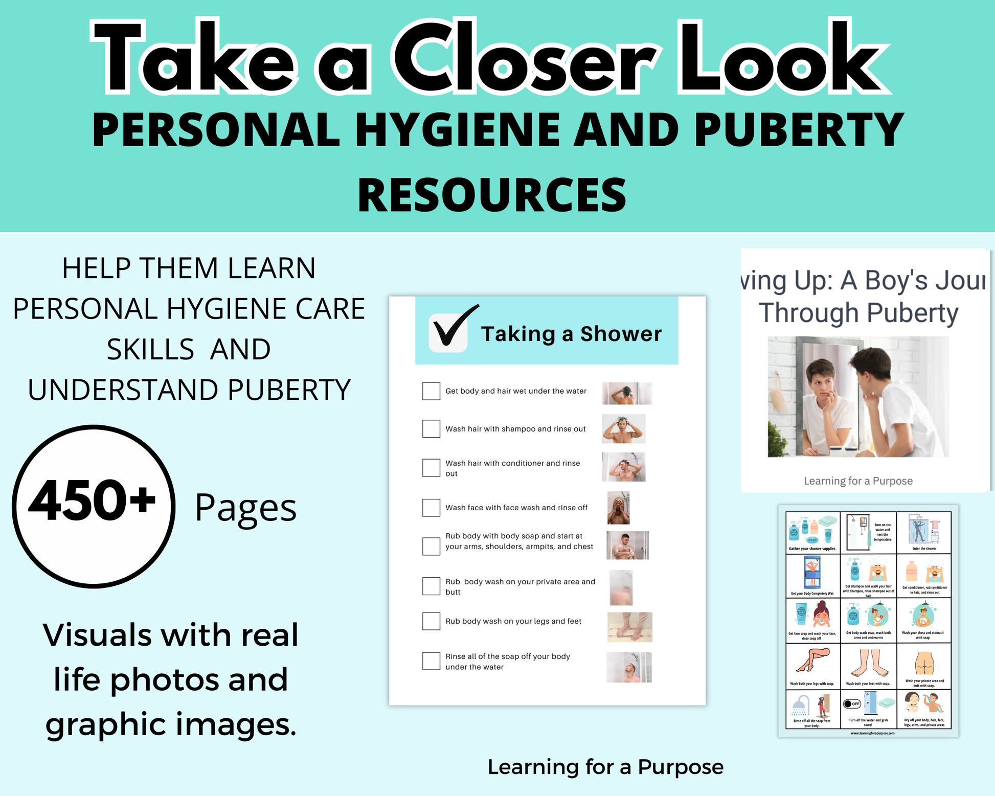 - Showering Visuals with Graphics: One-page visuals for showering, available for both boys and girls, to support understanding.