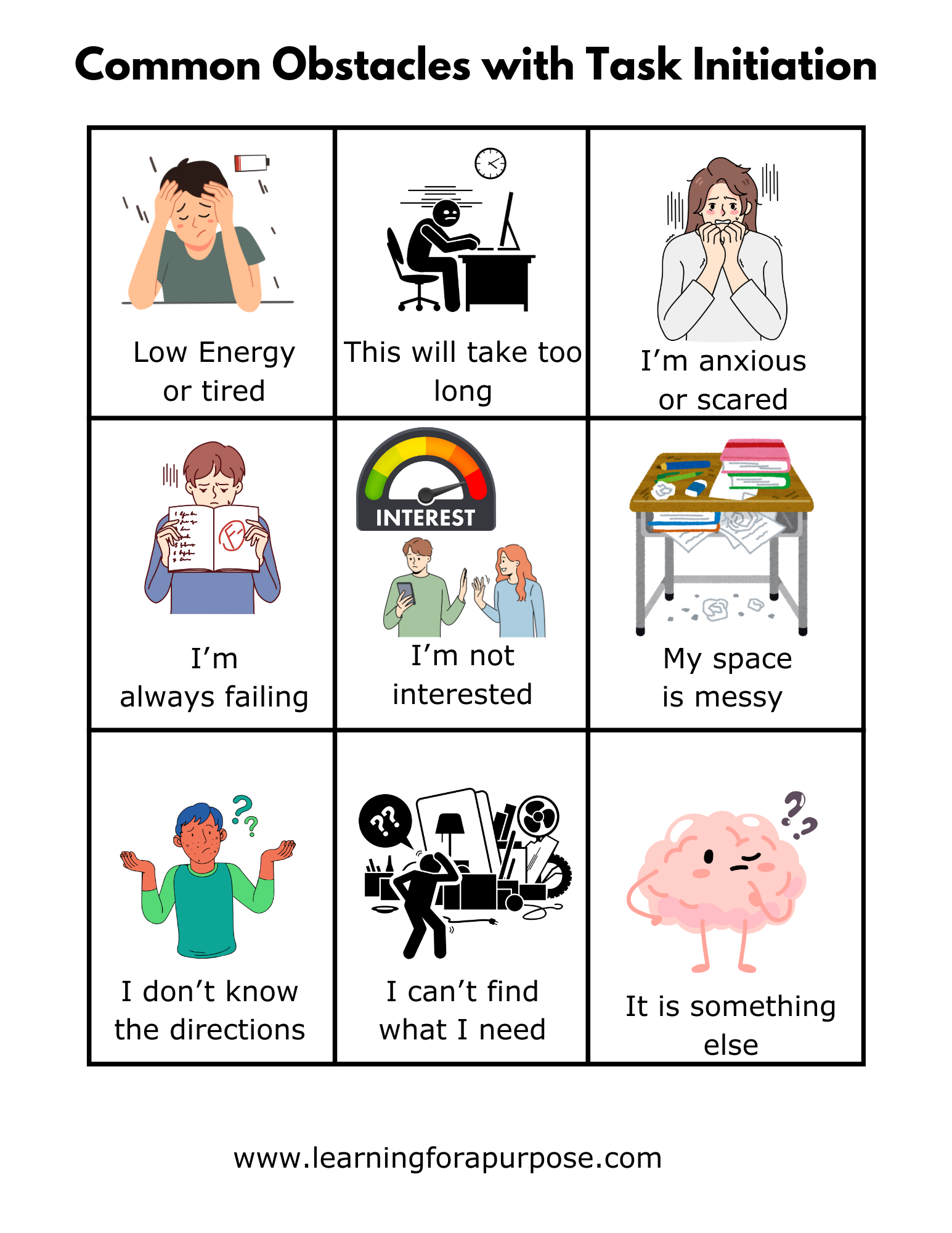 - Common Obstacles for Task Initiation: Visuals to show what obstacle may be getting in their way of getting started.