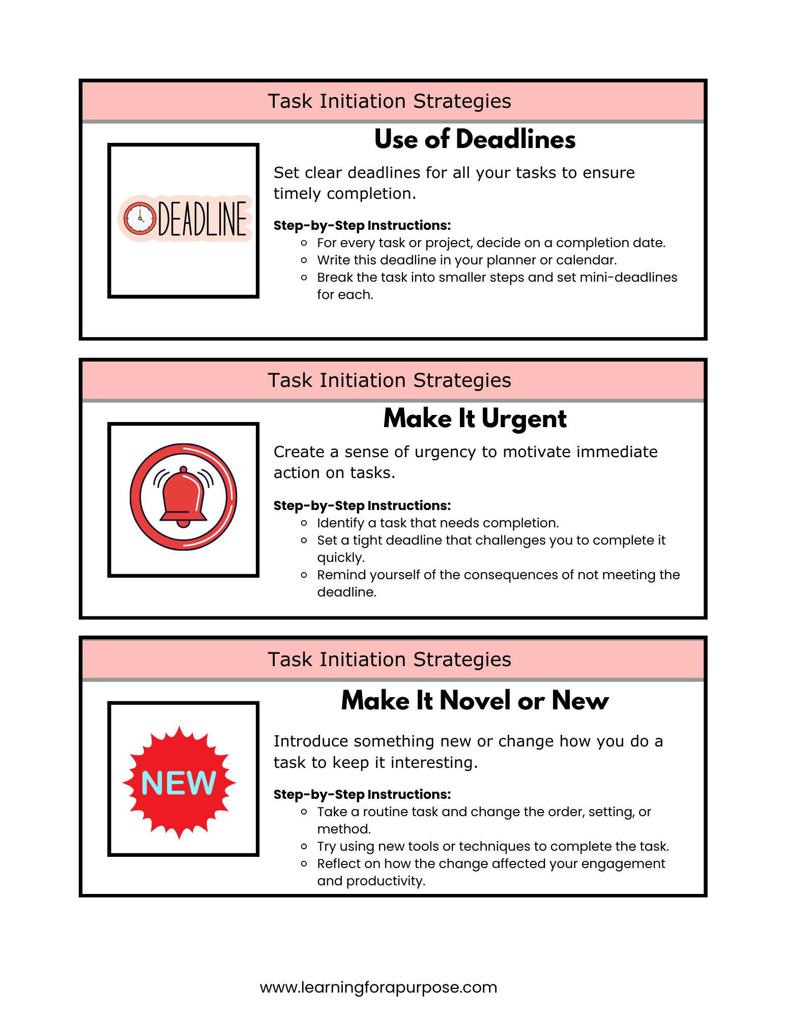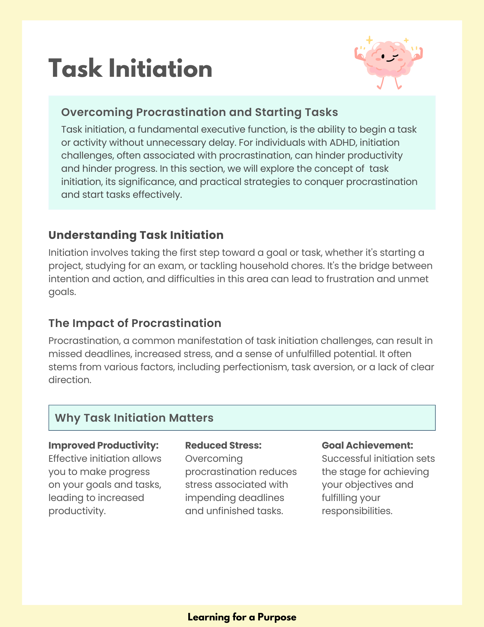 - Task Initiation Improvement Activities: A step-by-step guide with strategies for getting started.