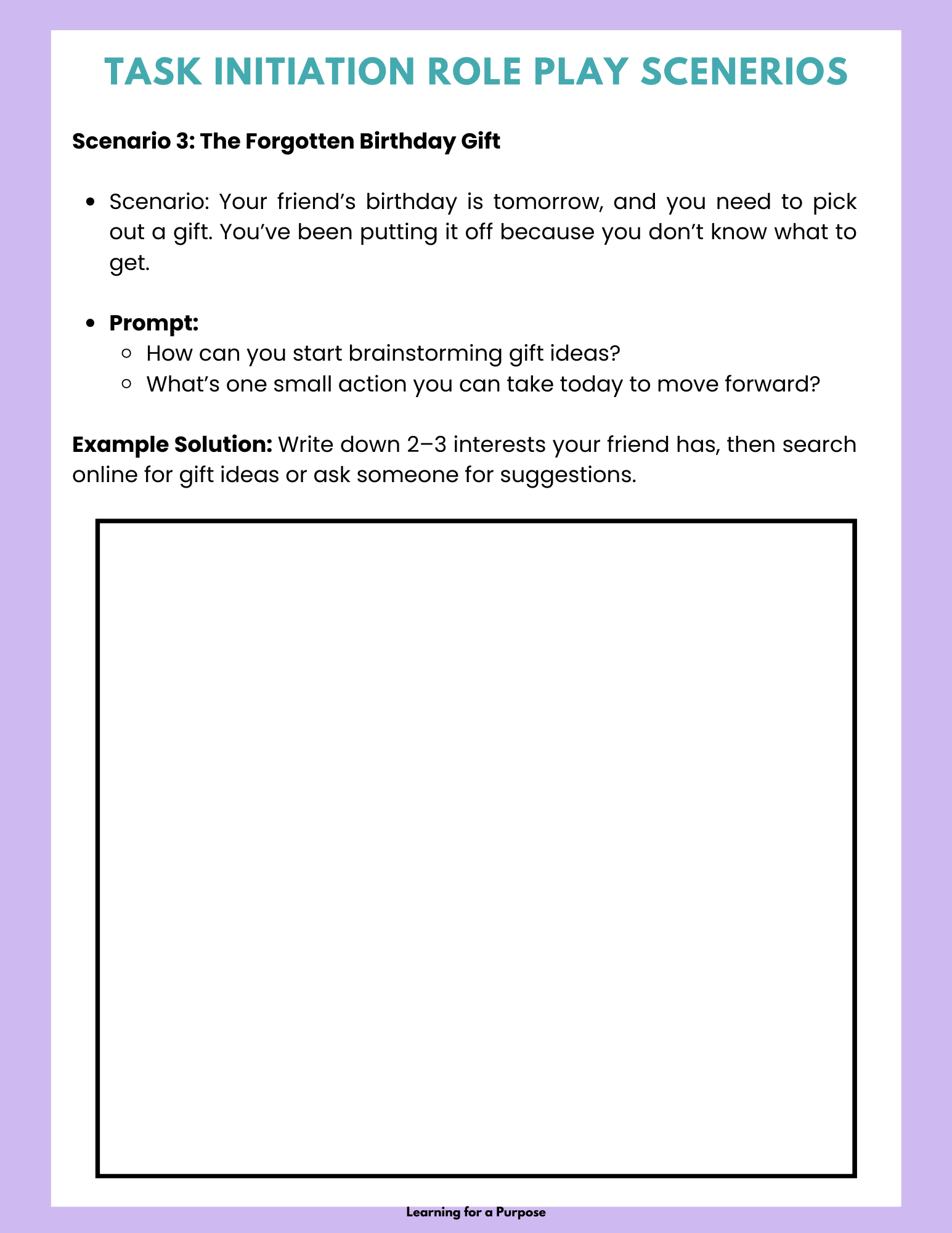 With the Task Initiation Workbook, you’ll gain everything you need to support task initiation skill-building and foster independence. Whether you’re a parent, teacher, therapist, or individual looking for solutions, this resource is your ultimate guide to overcoming procrastination and starting tasks with confidence.